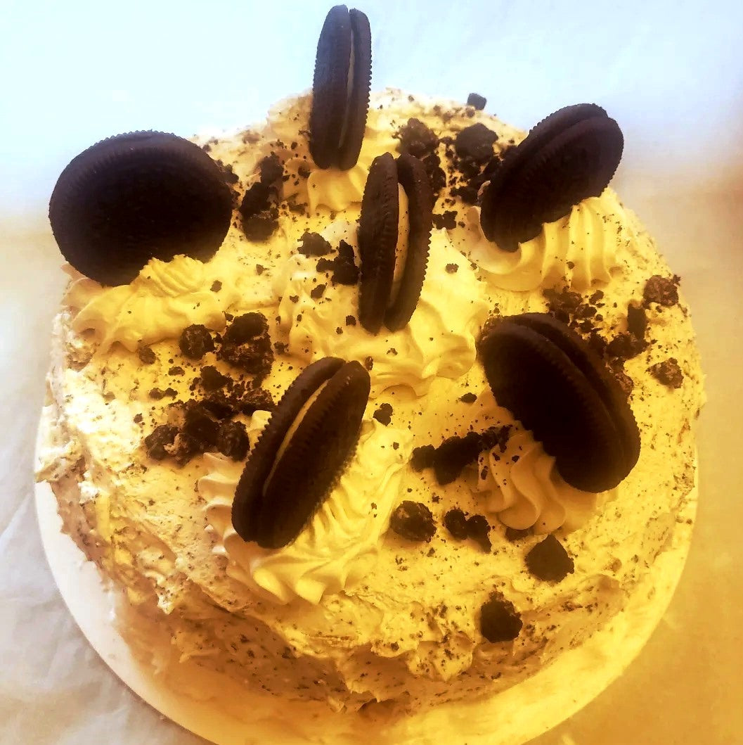 Made with GF oreos and can be a chocolate or vanilla cake base, with chopped Oreo cookies throughout.